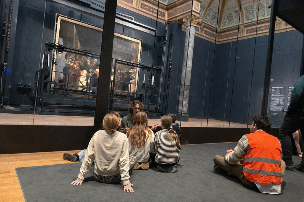 Leerlingen luisterden aandachtig naar het verhaal over grootmeester Rembrandt van Rijn en zijn wereldberoemde schilderij De Nachtwacht.