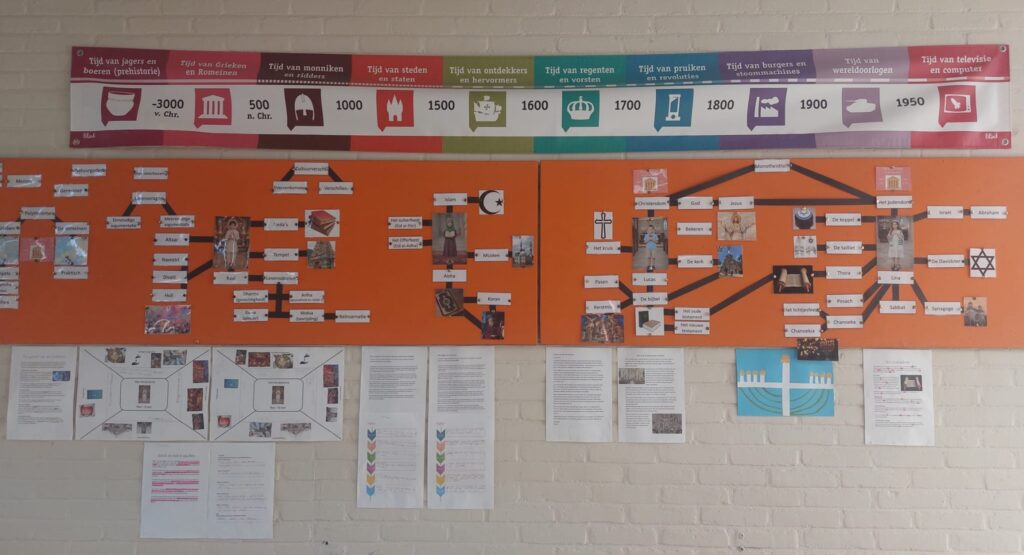 Van de leraren horen we dat sommige kinderen ook buiten school series gaan kijken of boeken gaan lezen over onderwerpen die in de klas aan bod zijn gekomen. In groep acht is de kennismuur compleet, met een volledige tijdlijn van de geschiedenis waarin het ontstaan van de verschillende geloven is opgenomen. Wie zijn anderen, waar komen zij vandaan, wat maakt dat zij zijn wie ze zijn? Wat zijn de verschillen, wat de overeenkomsten?
